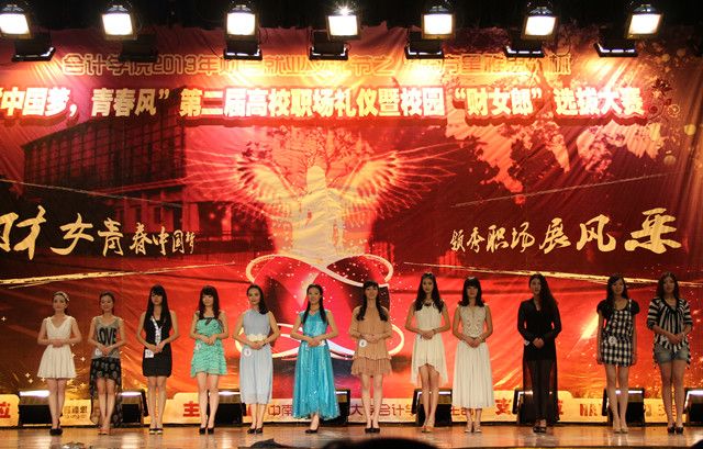 4月15日晚7:00,由中南财经政法大学会计学院团委、学生会主办,学生会女生部、蓝月礼仪队承办的“中国梦·青春风”第二届武汉地区高校职场礼仪大赛暨校园“财女郎”选拔赛决赛在南湖会堂举行,来自我校、华中农业大学、武汉科技大学、武汉纺织大学等高校的十二强“美女”选手进行职场礼仪和才艺比拼。本次比赛系会计学院第二届财会就业文化节系列品牌活动之一,旨在引起社会关注女大学生就业,提升女生就业能力,展现女生青春风采。