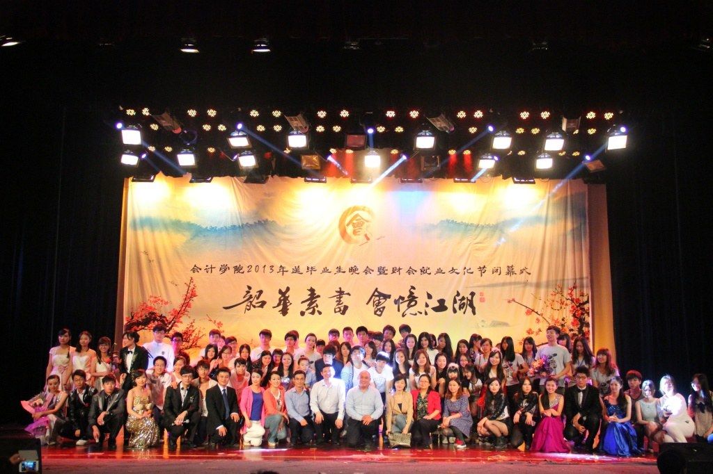 20135307时,由会计学院团委、学生会、研究生会主办的2013年送毕业生晚会暨第二届财会就业文化节闭幕式在南湖会堂成功举行。出席本场晚会的领导、老师有:中南财经政法大学副校长刘可风教授,校研究生院常务副院长唐国平教授,校保卫部张学平部长,会计学院院长张龙平教授,院党委肖翠祥书记,校党委宣传部邓杨副部长,湖北经济学院会计学院院长李长爱教授一行,博士生导师夏成才教授,院党委王延副书记,会计学院王雄元副院长、王华副院长,会计学院组织员王虎林老师,楚天都市报徐啸寒记者以及会计学院黄洁莉、彭艳、范纯俐、董丽华、刘筱彤、贺欣、陈敏、石中美、王惠芳、徐会超、孟曰、史永、宋丽梦、严丽娜、张昭妍、杨少同、彭岚、毛洪安等老师。毕业生家长代表、用人单位代表、学院各年级学生以及其他学院师生1000余人参加了本次晚会。美承苹果校园体验中心、东方星雅思等单位对晚会给予了支持。
