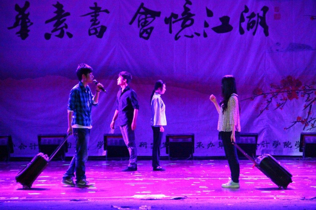 致辞过后便是晚会的正式表演内容,包括内容丰富的歌曲、舞蹈和话剧等。首先登场的是在校民歌大赛中荣获三等奖,大一的学生代表从首义专程到南湖演唱的作品《在那遥远的地方》,优美空灵的和声让现场的观众如梦如幻。然而接下来融合会计知识的古装剧《希贤岭论剑》以及融合多种曲风舞蹈的男生表演 “雷人舞”《笑嗷江湖》又让大家捧腹大笑。晚会现场掌声不断,气氛热烈,把晚会推向了一个高潮。