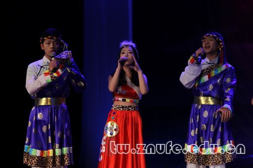 “卓玛”,雪域高原上最美的风景。来自财政税务学院的藏族同学,用一首《卓玛》为我们叙述了质朴热情的藏族小伙对魂牵梦绕的姑娘的相思之情嘹亮的歌声却不乏缠绵的情意,“青青子衿,悠悠我心”,卓玛啊,我心中的姑娘,你可听到我日夜的深深的思念。。身着藏族服饰,随着音乐欢快舞蹈,四个姑娘将象征敬意和爱意的洁白哈达献给了评委老师。舞台上藏族小伙的声声呼唤,换来了台下阵阵掌声。