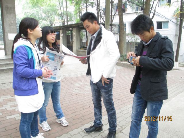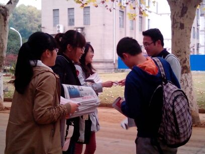 上午7点半,志愿者们冒着严寒,早早来到首义校区图书馆集合,着手义卖活动的分工,然后分别在首义校区、武汉理工大学、华中科技大学三个地点进行报纸义卖。