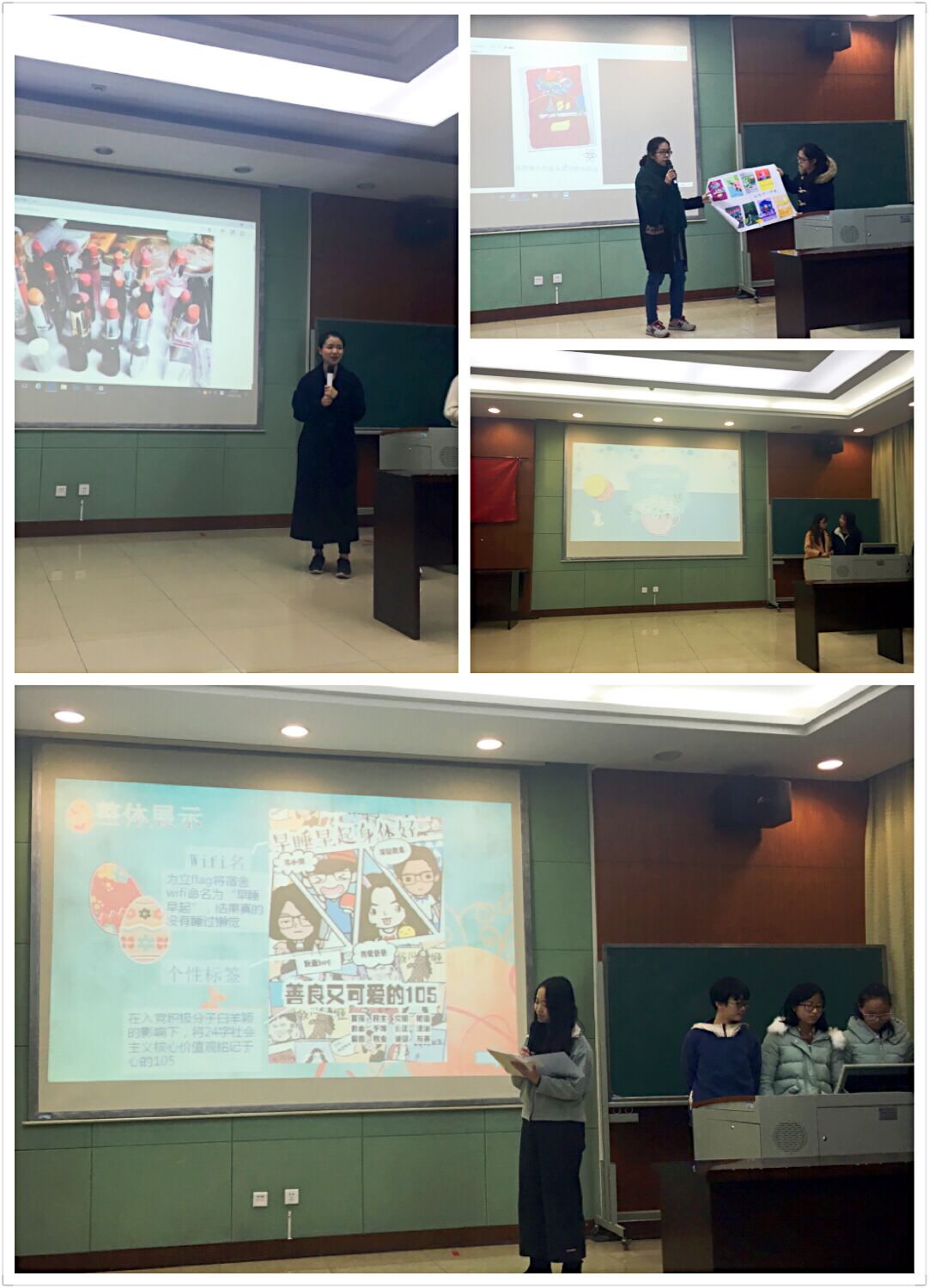 现场展示环节中,同学们都积极准备。才艺类作品中,有的寝室现场弹唱,有的播放录制的趣味视频,有的表演英文版话剧,表演形式丰富多彩、趣味性十足,赢得了现场观众的一致好评。颜值类比赛中,寝室进行现场化妆教学、护肤保养、服装搭配环节,为同学们带来实用的护肤秘籍;设计类、旧物DIY项目中,寝室成员带来自己的手工艺品并进行简短的介绍,不仅使同学们发现了身边的宝物,获得了妙趣横生的旧物改造妙招,更挖掘了一批设计大神。