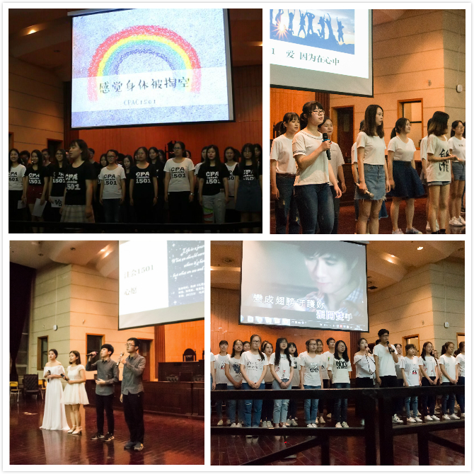 其中CPAC1501、国会1501、会计1501、注会1501分别带来四首合唱——“感觉身体被掏空”、“爱,因为在心中”、“情歌王”、“心愿”。或歌词新颖、创意十足,或悠扬婉约,或真挚动人,给观众们带来了一场听觉盛宴。