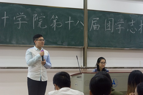 在分团委副书记阮士亮的主持下,宣讲会正式开始。首先是学生会主席景兴涛发言,他为新生们介绍了团学志的概况,并提出对部门选择的建议以及对同学们的期望,最后对同学们参与此次宣讲会表示了由衷的感谢。