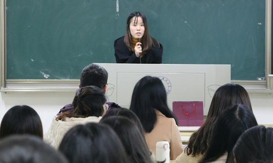 接着,工商管理学院郑丽娇同学分享自己的求职历程。郑丽娇在分享面试经历过程中,重点讲述了群面与单面技巧。期间特别指出,写面试总结有助于认识自我、稳住心态,在群面时,同学们需明确自身定位,密切关注群面时间,并且要有团队精神。