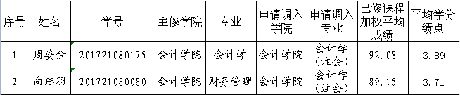 根据《中南财经政法大学本科生调整修读专业管理办法(修订)》(中南大教字[2017]17号)文件精神和《关于做好2017级普通本科学生调整修读专业工作的通知》的要求,经审核,下列学生符合申请调整修读专业的要求,予以公示。公示时间为2018年3月7日-9日。如有异议,请于2018年3月9日11点前将书面申请交到会计学院教学办。