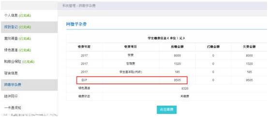 可以在此处查看自己的应缴学杂费金额,并点击“点击缴费”按钮进行缴费。