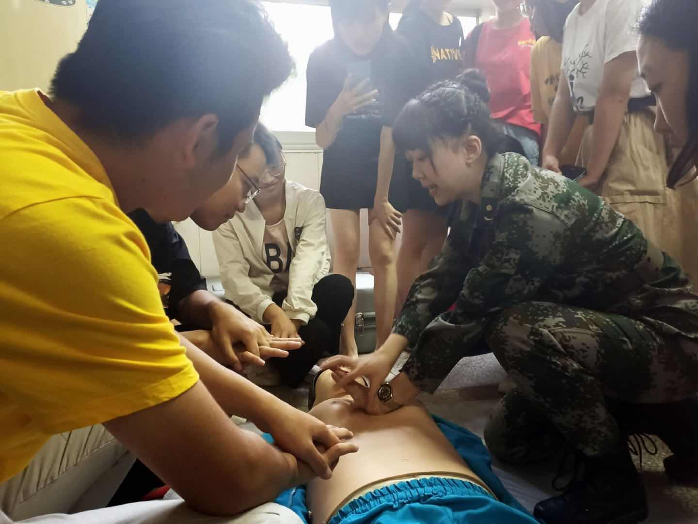 活动中,黄致远医生以通俗易懂的语言阐述了学好急救知识的重要性,详细讲解了应对热射病等突发状况、心肺复苏、气管异物急救的具体步骤,酒精中毒的“两脱一风”处理办法,并对心脏按压手法与力度,海姆利克操作手法等进行了由浅入深的分析讲解,且通过现场演示,全面展示了突发事故的现场救助流程,引发了同学们的浓厚兴趣。在讲解完毕后,医护人员邀请同学们亲身体验,并现场解疑,增强了同学们的体验感和实操能力,同学们也都踊跃体验,现场气氛良好。
