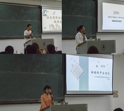 本次开班仪式分为两阶段。第一阶段进行的是第十三期“青年马克思主义者培养工程”新学员培训。学生会秘书部部长王港同学为大家介绍公文写作及财务报销流程。团委宣传部技网中心吴婉玲同学、新媒体中心辛楚婷同学分别为大家讲解PPT,Pr,Ae、新媒体平台建设等。学员们认真聆听,积极学习。