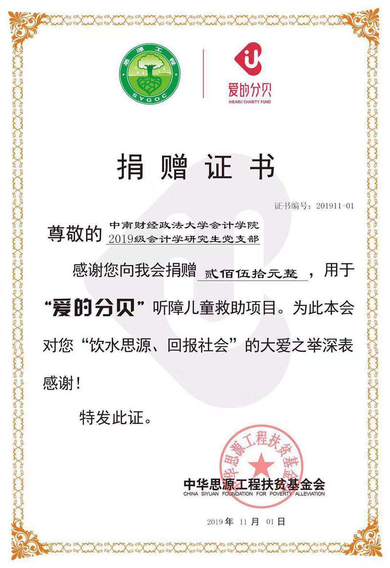 11月1日,2019级会计学研究生党支部收到了一张来自中华思源工程扶贫基金会的特别证书,感谢该支部为“爱的分贝”听障儿童救助项目捐赠善款的大爱之举。