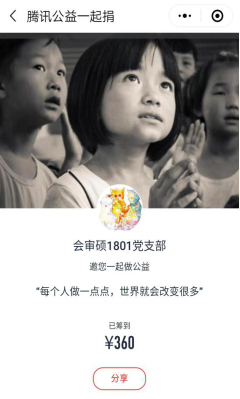 此次活动借助新媒体“腾讯公益”平台展开,共分为讨论——献爱心——传播三个环节。在讨论环节中,党支部书记周孜潜同志在党支部微信群中介绍此次活动的意义和目的,希望党员同志不仅要“不忘初心、牢记使命”,自身做起,关爱弱势群体,用爱为一个个平凡的梦想做出点滴贡献,另一方面也要扩大宣传,让更多人加入到帮助他人的活动中来,为有困难的儿童点亮明天。在献爱心环节,各位党员同志自愿在“腾讯公益”平台上进行捐款,支部共筹到360元,助力困境儿童圆幸福梦。献完爱心,党员们纷纷通过分享的模式,将此次公益活动转发到朋友圈,让更多人参与到此次爱心活动中来,也使得更多人能够关注到困境儿童这个群体。 (撰稿:周孜潜)