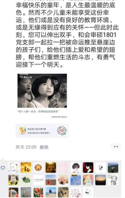 在“不忘初心、牢记使命”主题教育中,会审硕1801党支部于10月25日在支部微信群进行了一场特别的爱心志愿活动——怀揣奉献之心,助力困境儿童。