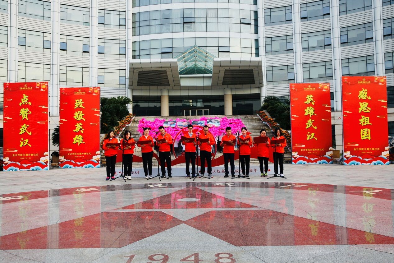 随后,会计学院全体辅导员陈楠、陈俊华、董丽华、范纯琍、黄艳、杭慧喆、孟曰、向传殿、姚健、张昭妍进行配乐诗朗诵:“点赞武汉,致敬英雄,英雄武汉,感恩祖国”,献给以钟南山、张伯礼、张定宇、陈薇院士为代表的在抗疫中奋斗在一线的人民英雄们。“