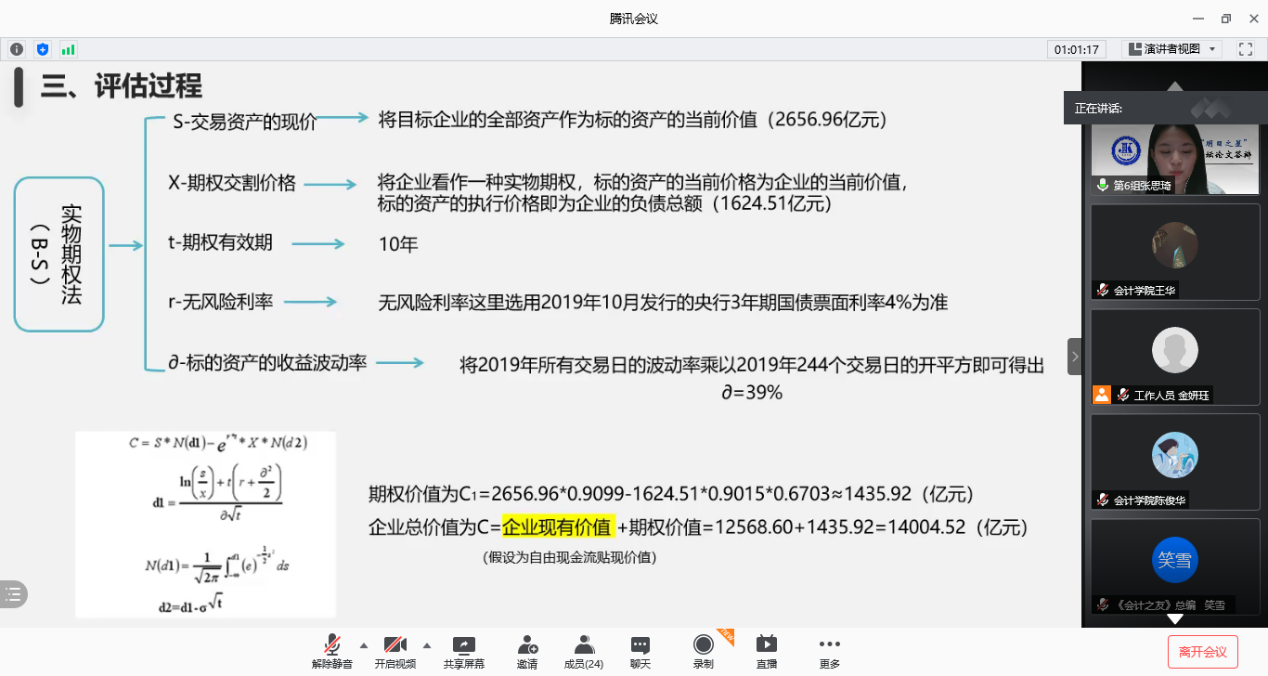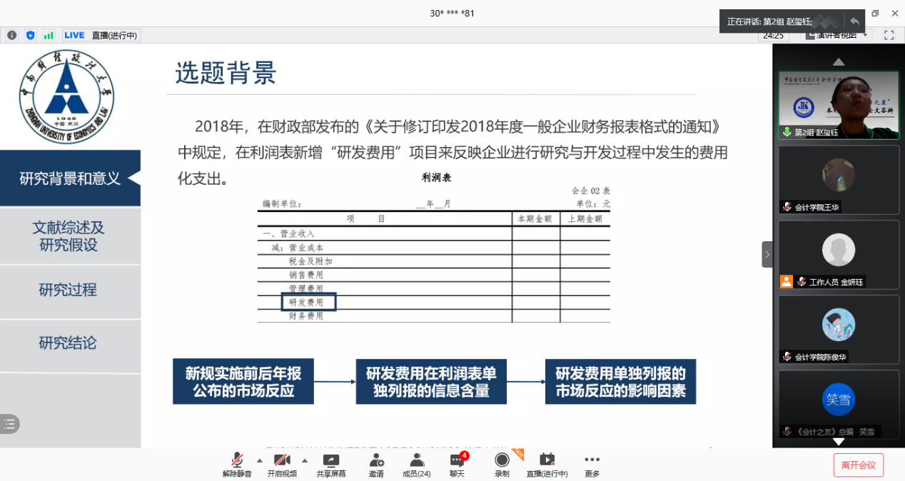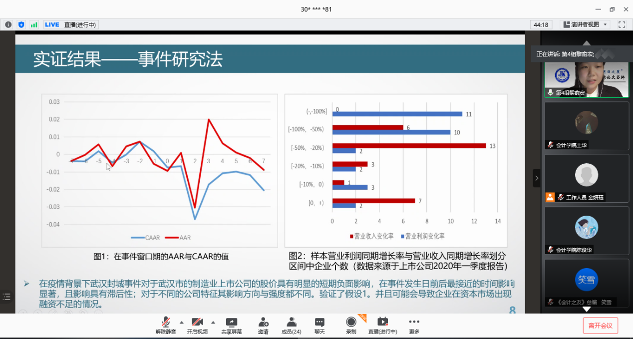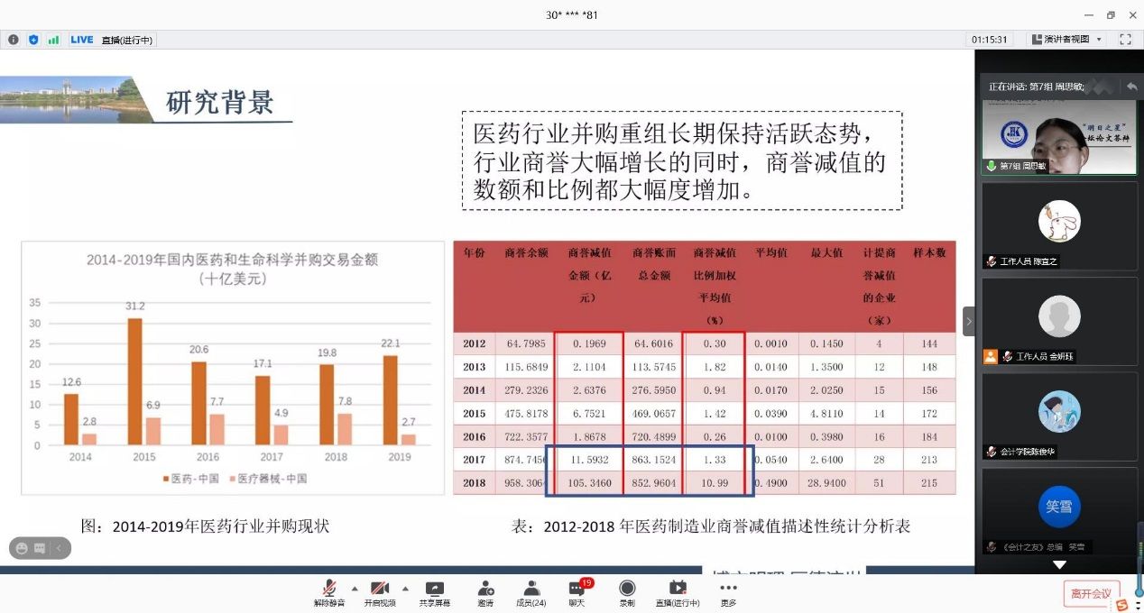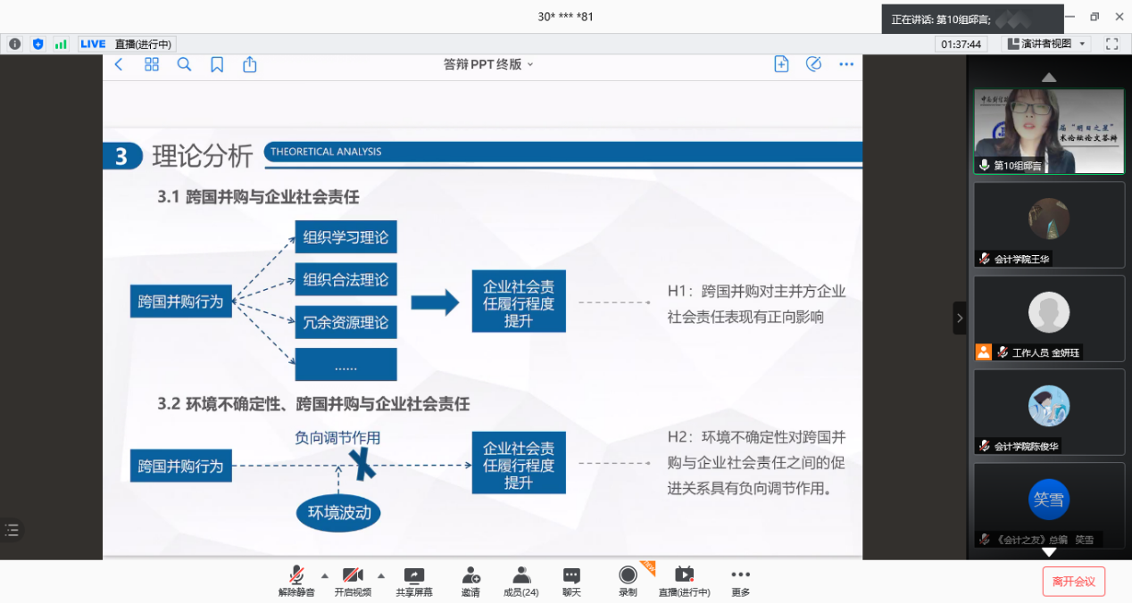 11篇论文依次进行答辩,作者们从课题背景、研究思路、研究方法、研究结论等方面进行方面进行阐述,论文答辩内容详实而精彩。论文紧跟时事,既关注了互联网+、并购重组政策放宽等宏观经济背景,又聚焦价值共创、对赌协议等财经热点,呈现出较高的专业素养和较强的创新意识,赢得了评审专家的一致好评,也让直播间里慕名学习的同学获益匪浅。