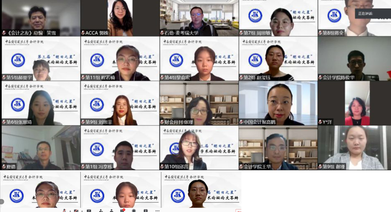(撰稿人:王华,陈俊华,金妍珏)10月29日晚,会计学院第三届“明日之星”本科生学术论坛采用视频会议的方式举行。会计学院院长张敦力担任论坛组委会主席,副院长王华主持本次答辩,中国会计报采编二部主任高鹤、武汉大学经济与管理学院副院长李青原、麦考瑞大学教授石劲、《会计之友》杂志社总编笑雪、武汉理工大学管理学院副院长夏德、《统计与决策》杂志社编辑部主任余洋、《财会月刊》杂志社副主编张瑾等担任评审专家,ACCA中国区武汉教育及学员发展主管郭姝作为支持方致辞并祝贺开幕。