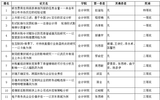 最后,笑雪总编宣布了获奖名单,由会计学院赵玺钰的《研发费用在利润表单独列报的信息含量——来自年报公布市场反应的经验证据》获得特等奖,会计学院程若楠的《上市前分红之谜:基于中国IPO定价的实证分析》等2篇论文获一等奖,会计学院郝曼宇的《跨界并购中对赌协议防范商誉减值风险研究——以智度股份并购猎鹰网络为例》等4篇论文获二等奖,会计学院邱言的《环境不确定性、跨国并购与企业社会责任》等4篇论文获三等奖。