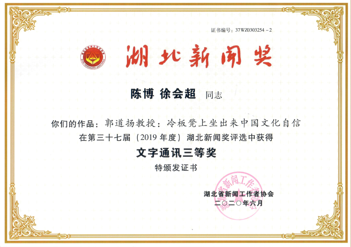 (通讯员 赵侃 畅雅莉)近日获悉,在第37届湖北新闻奖评选中,经省委宣传部审定,我院党委副书记兼副院长徐会超同志作为通讯员、校宣传部陈博同志作为记者在我校校报上刊登的作品《郭道扬教授:冷板凳上坐出来中国文化自信》获“文字通讯三等奖”,由湖北省新闻工作者协会颁发荣誉证书。