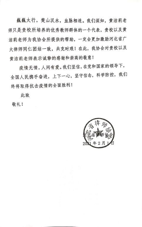 (通讯员 畅雅莉 李瑞玲)近日,学校收到河北省律师协会发来的感谢信,赞扬会计学院黄洁莉副教授公益授课,支持河北省律师协会会员居家学习的先进事迹。