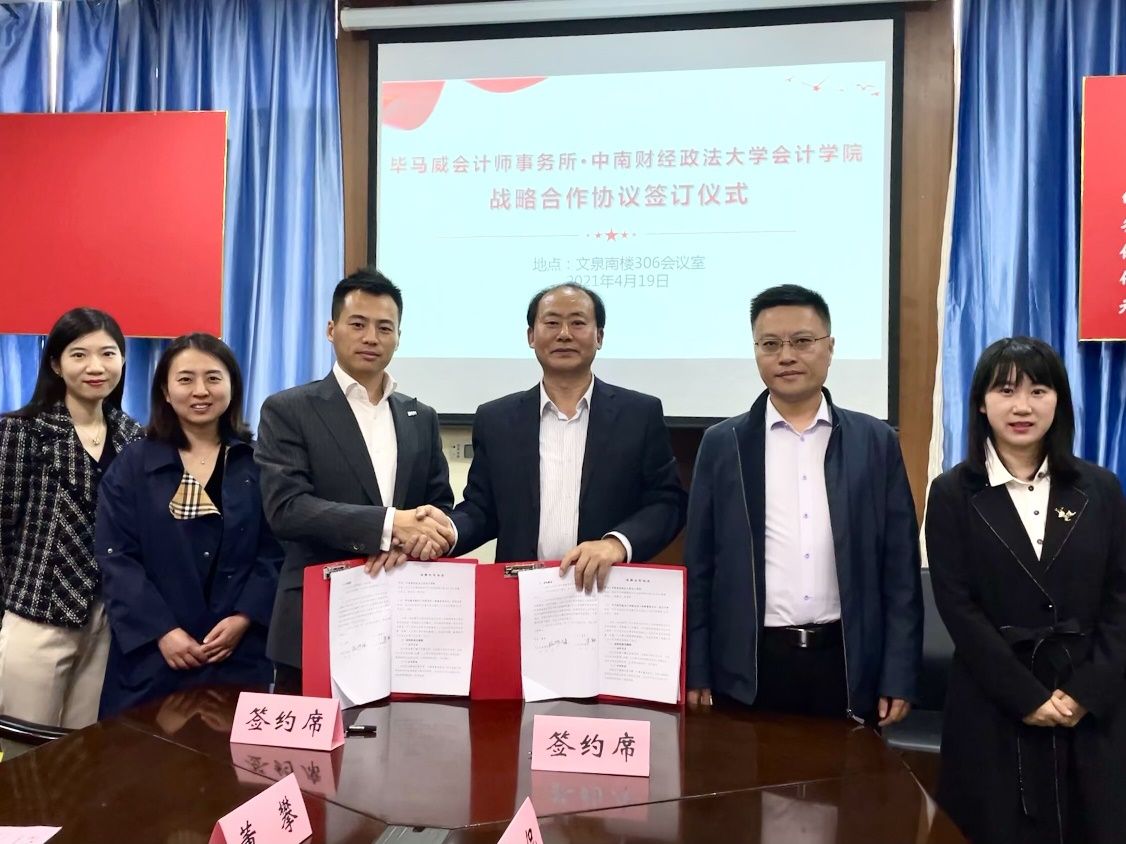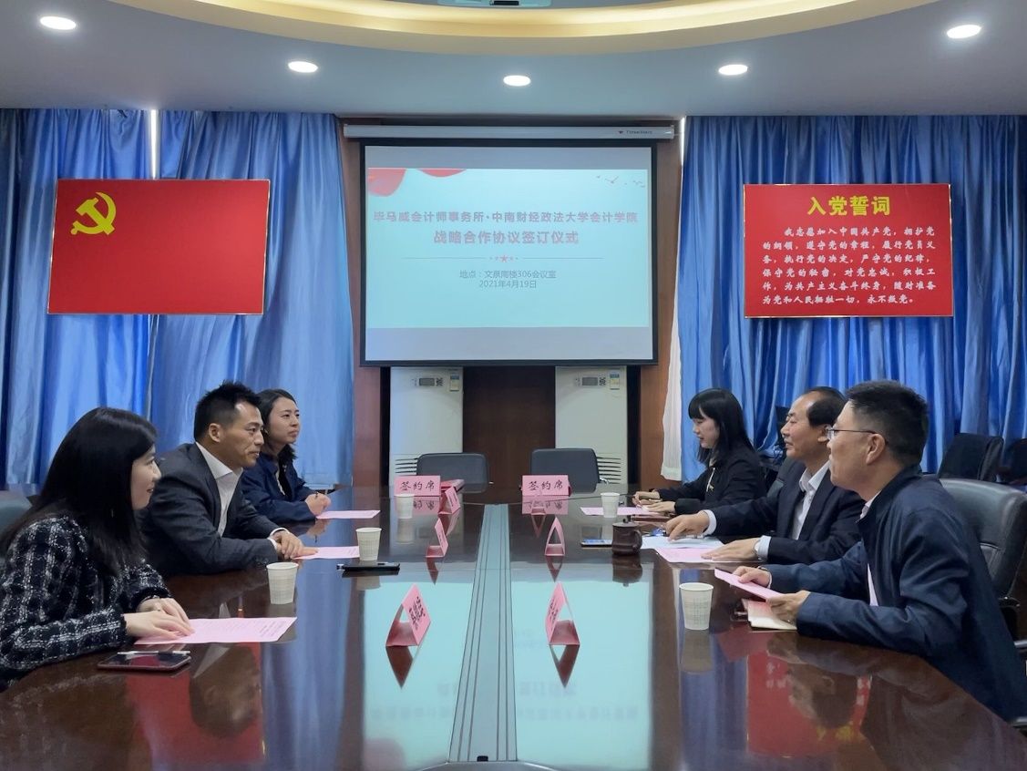 2021年4月19日下午,中南财经政法大学会计学院与毕马威会计师事务所武汉分所(以下简称“毕马威”)战略合作协议签订仪式在文泉南楼306会议室举行。毕马威武汉分公司首席合伙人陈轶、武汉分公司审计高级经理董攀、华东华西区校园招聘负责人蔡麟珺莅临我校,会计学院党委书记殷修林、党委副书记兼副院长徐会超等出席了仪式。仪式由徐会超副书记主持。