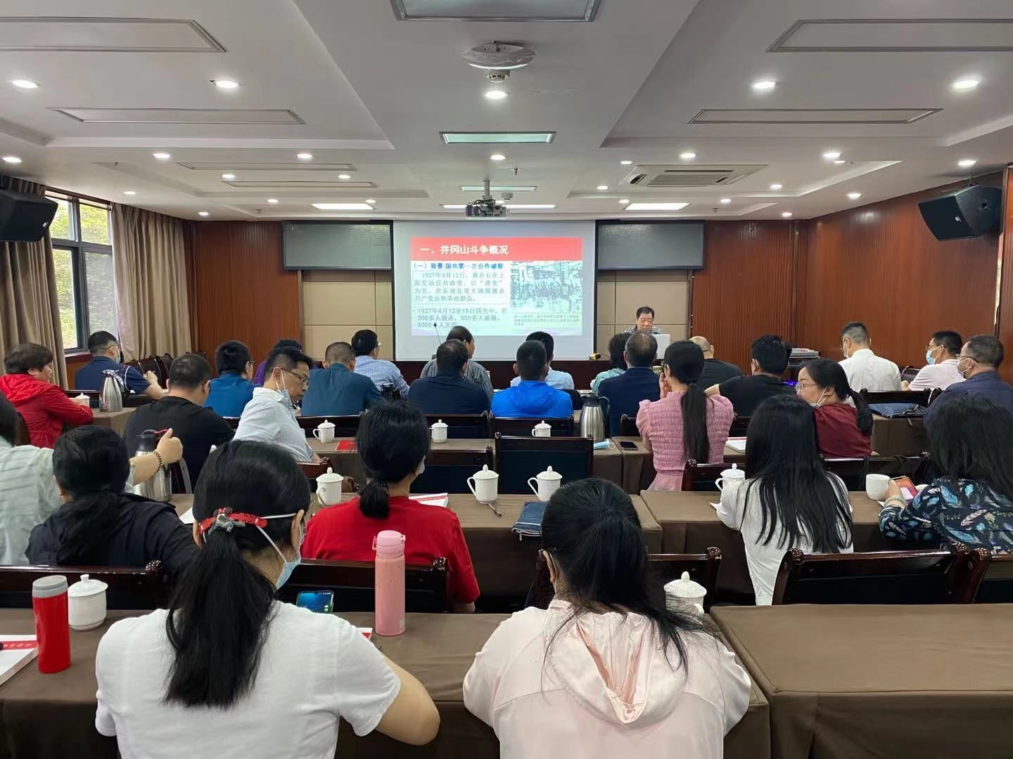 中国井冈山干部学院副院长匡胜等主讲《井冈山斗争与井冈山精神》。报告会上首先回顾了井冈山斗争的概况,重点讲解了井冈山斗争时期党的建设,分析了井冈山斗争时期的经验教训,总结得出让井冈山精神放射出新的时代光芒,要坚定执着追理想;实事求是闯新路;艰苦奋斗攻难关;依靠群众求胜利。