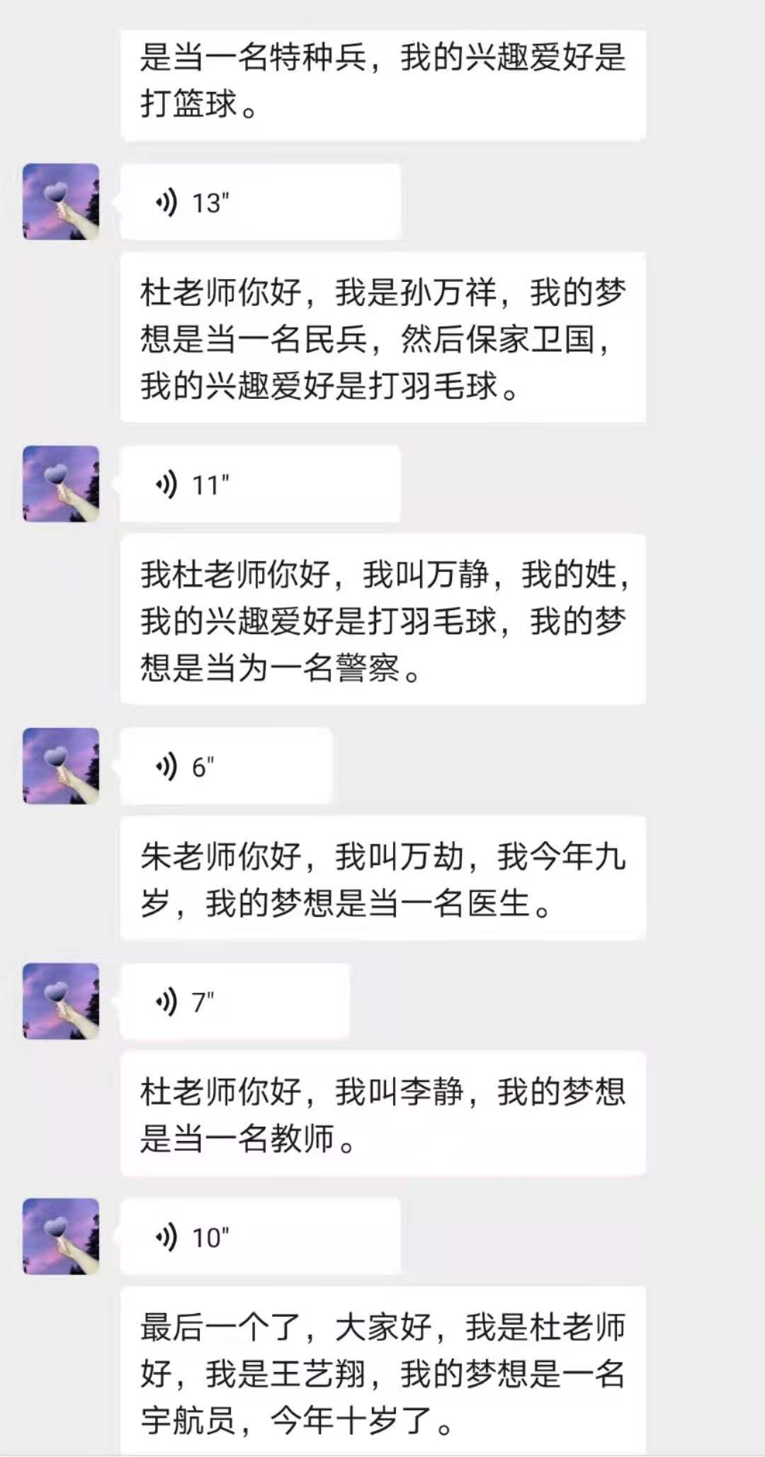 接着,杜晓伟同志以北京一年级学生冯子翰为例分享了市区学生学习现状,从语文写作、英语学习和音乐学习上进行引导,并邀请箭坝小学三年级同学们分享自己的梦想,杜晓伟同志提出:学习本身有些枯燥,重点是发现兴趣,如果暂时没有兴趣,不妨先试着努力听课、写作业,小成就累积从而提升兴趣。