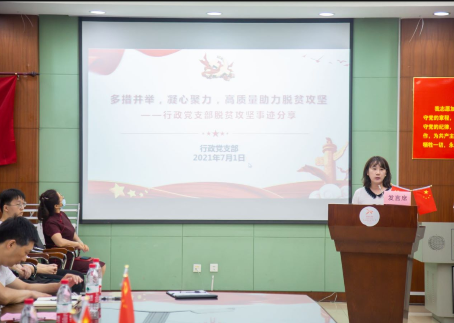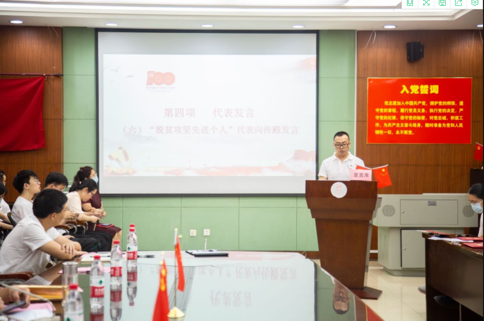 “脱贫攻坚先进集体”代表行政党支部副书记赵侃介绍行政党支部多措并举,凝心聚力,高质量助力脱贫攻坚事迹。从结对资助贫困学子对口帮扶红石村、箭坝村,到爱心购买贫困地区农副产品开展消费扶贫。行政党支部将继续拥护院党委的领导,发挥支部特色优势,高质量完成定点帮扶任务,助力脱贫攻坚,同时以党史学习教育为契机,努力为师生办实事,向先进典型学习,为会计学院各项事业发展贡献力量。
