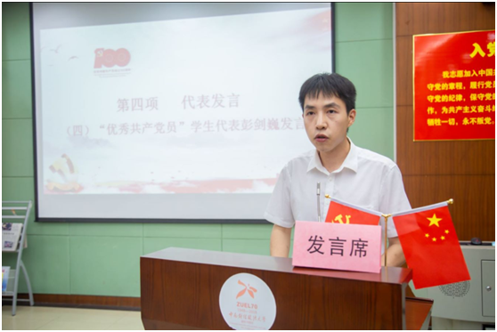 “优秀共产党员”学生代表彭剑巍分享了自己在党史学习、支部党务工作与志愿活动中的心得体会。他表示未来自己将继续向着第二个百年奋斗目标、向着中华民族伟大复兴的中国梦奋勇前进,为学校双一流学科建设继续贡献青年力量。