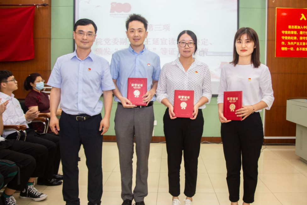 学院党委书记殷修林为学院“先进基层党组织”、“优秀党务工作者” 获奖对象颁发证书。