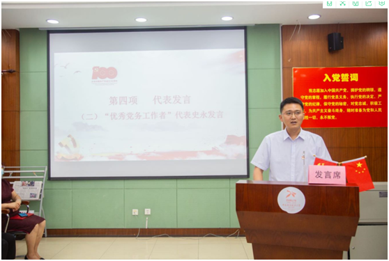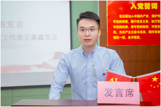 “优秀共产党员”教职工代表王嘉鑫从回顾过去、立足当下和展望未来三个方面展开汇报。自中南大本科阶段申请加入中国共产党,到来学院工作的三年时间的教学、科研、社会服务等各项工作,王嘉鑫认为自己的毕生追求是做一名有情怀、有思想,全心全意为党和学院的教育事业奉献的“教书匠”。最后,他祝福中国共产党红红火火,祖国繁荣富强,会院再创辉煌。