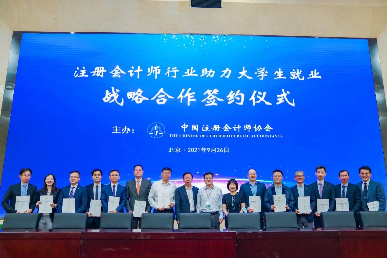 2021年9月26日,由中国注册会计师协会(以下简称“中注协”)举办的注册会计师行业助力大学生就业战略合作协议签约仪式在北京国家会计学院国际会计中心举行。中注协党委书记、秘书长舒惠好,中注协党委委员、纪委书记田志心,北京国家会计学院院长秦荣生等出席仪式,来自全国高等财经院校代表以及会计师事务所代表参加仪式。签约仪式由田志心书记主持。