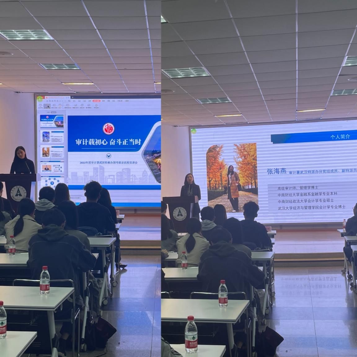座谈会结束后,审计署武汉特派办在文潭楼三楼招聘厅举行了专场招录宣讲会,张海燕副特派员以学姐的身份亲自向同学们介绍了审计署及审计署武汉特派办的基本概况以及2022年招录方式、招录程序和岗位需求,鼓励并鞭策大家积极报名并投身新时代中国特色社会主义审计事业!