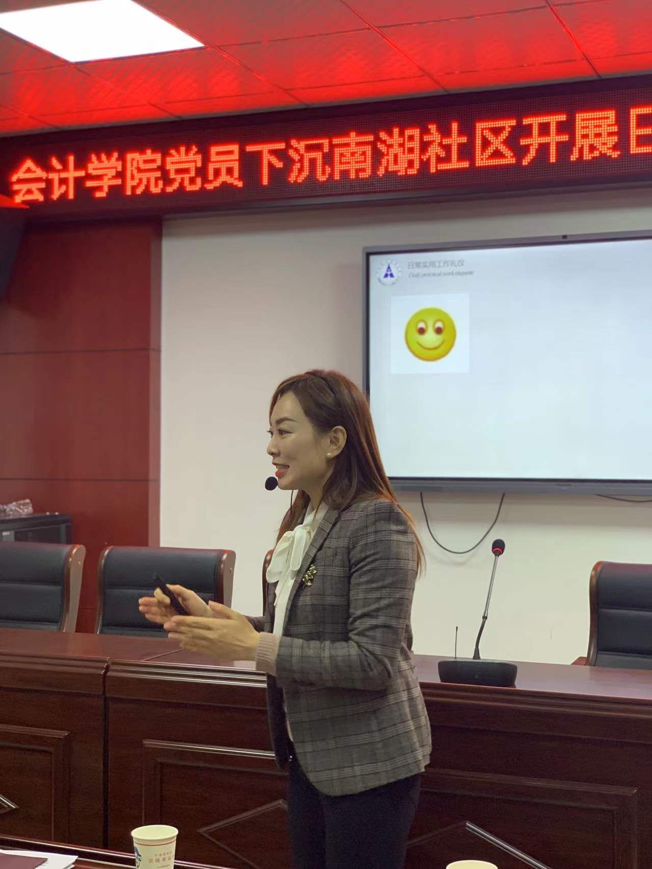 (通讯员 王子行) 11月30日上午9:30,会计学院党委组织学院党员下沉南湖社区开展日常实用工作礼仪培训活动,会计学院党委副书记徐会超、副院长冉明东、党委副书记胡桂锬等20余名教工党员参加活动,学校第二届“教书育人奖”获得者、财务管理党支部纪律委员黄洁莉老师为南湖社区干部和工作人员进行日常礼仪的培训。活动由院党委副书记徐会超主持。