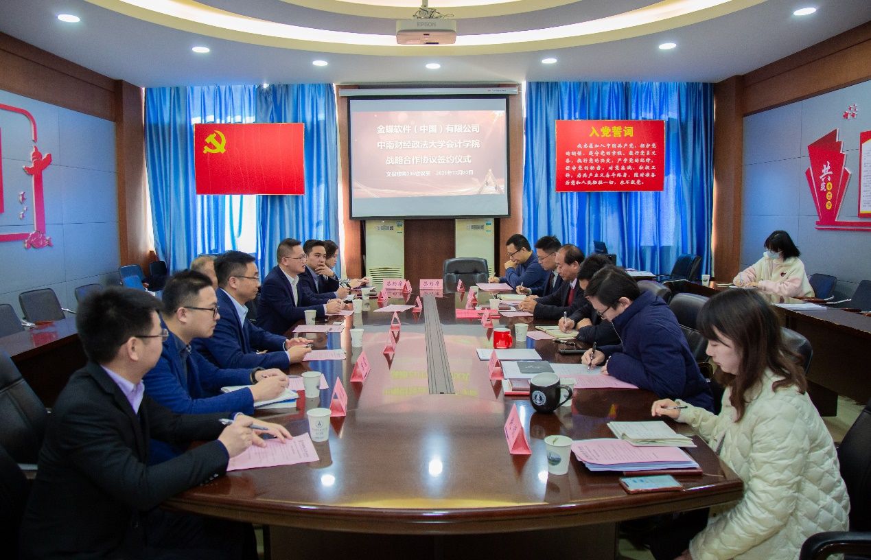 (通讯员:赵侃 王雪颖)2021年12月23日上午,中南财经政法大学会计学院与金蝶软件(中国)有限公司战略合作协议签订仪式在文泉楼南306会议室举行。金蝶软件(中国)有限公司高级副总裁、战略发展部总经理孙雁飞,金蝶精一信息科技服务有限公司总经理陈跃,金蝶软件湖北省公司总经理陈慧蛟,金蝶精一鄂黔区总监莫才龙、高级客户经理陈震,金蝶软件市场部总监高金,金蝶精一客户成功部总监柯淦莅临我校,会计学院院长张敦力,党委书记殷修林,党委副书记、纪委书记兼行政副院长徐会超,副院长冉明东,党委副书记胡桂锬等出席了仪式。会议由殷修林主持。