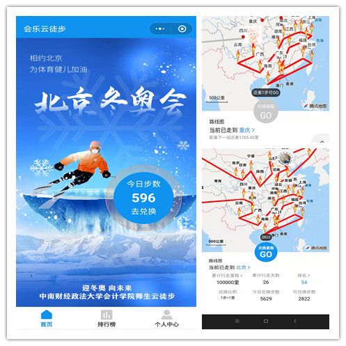 在为期一个月的活动中,会计学院师生每日登录小程序,将“微信运动”记录的行走步数按一定比例兑换成冬奥会圣火传递站点里程数。不断积攒里程数后,按顺序解锁34个省级行政区站点,点燃相应的“奥运圣火”,并学习一个冬奥会小知识,直至完成10万里的总里程数后,到达云徒步的终点站——北京。