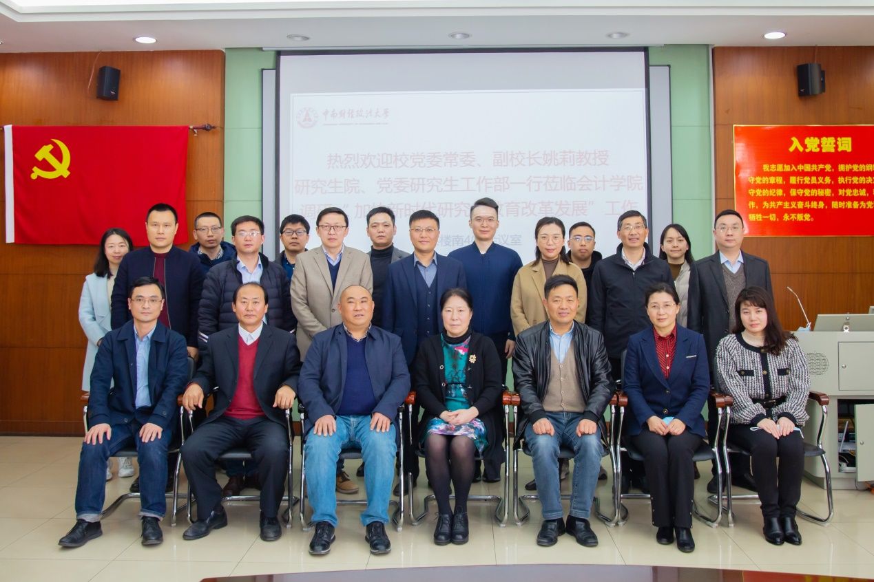 (通讯员:张昭妍 崔荡荡)为进一步提高新时代研究生培养质量,促进研究生教育发展,2022年3月9日上午,校党委常委、副校长姚莉教授带领研究生院、党委研究生工作部领导班子成员一行赴会计学院开展“加快新时代研究生教育改革发展”专题调研。研究生院院长胡弘弘、党委研究生工作部部长肖翠祥、研究生院副院长王华、党委研究生工作部副部长白玉、研究生院副院长黄雯等参加调研。会计学院全体院领导班子成员、硕士与博士研究生导师组组长、党政办公室、研究生教育工作办公室相关工作人员参加调研座谈会。会议由会计学院党委书记殷修林主持。