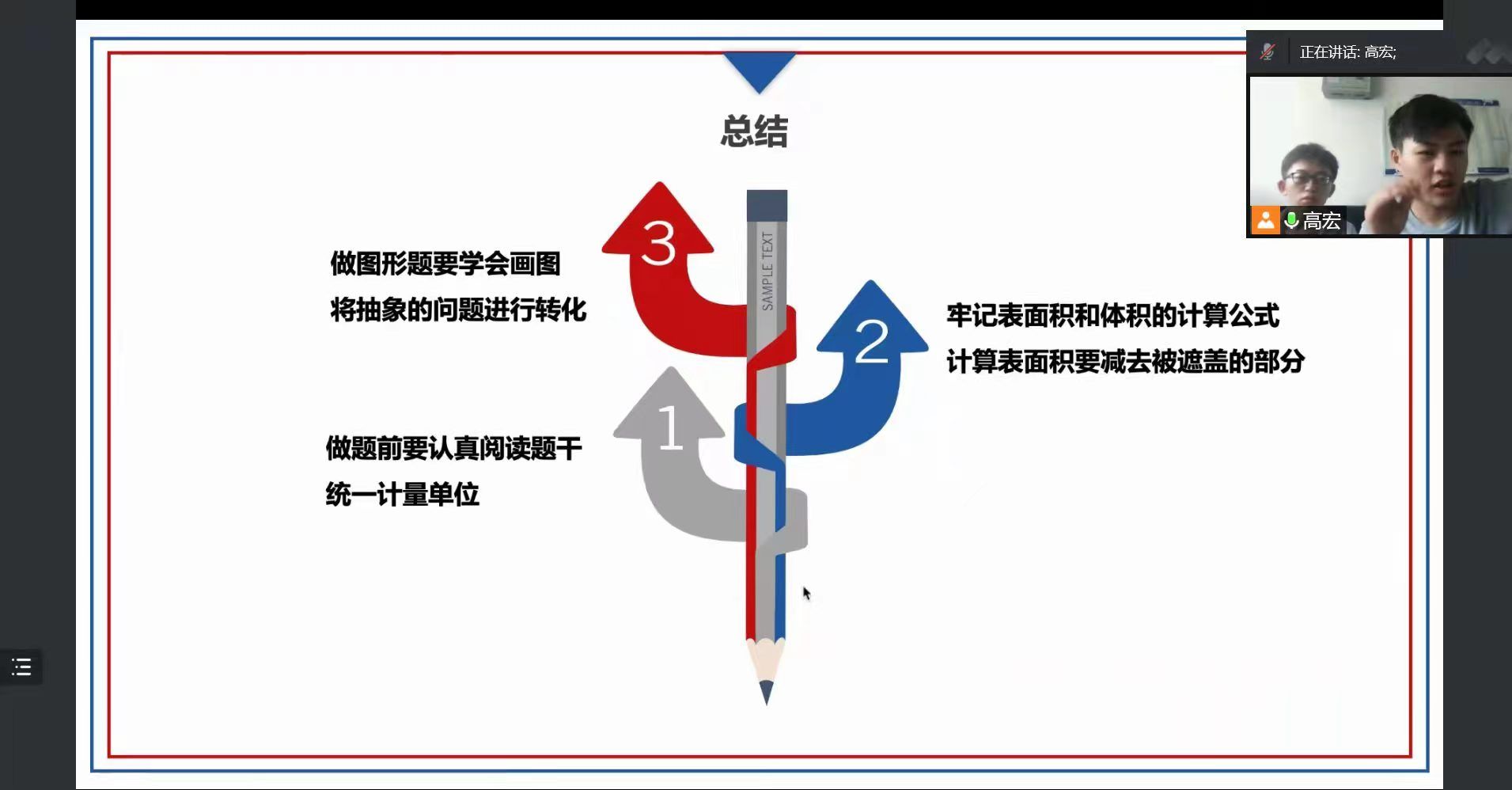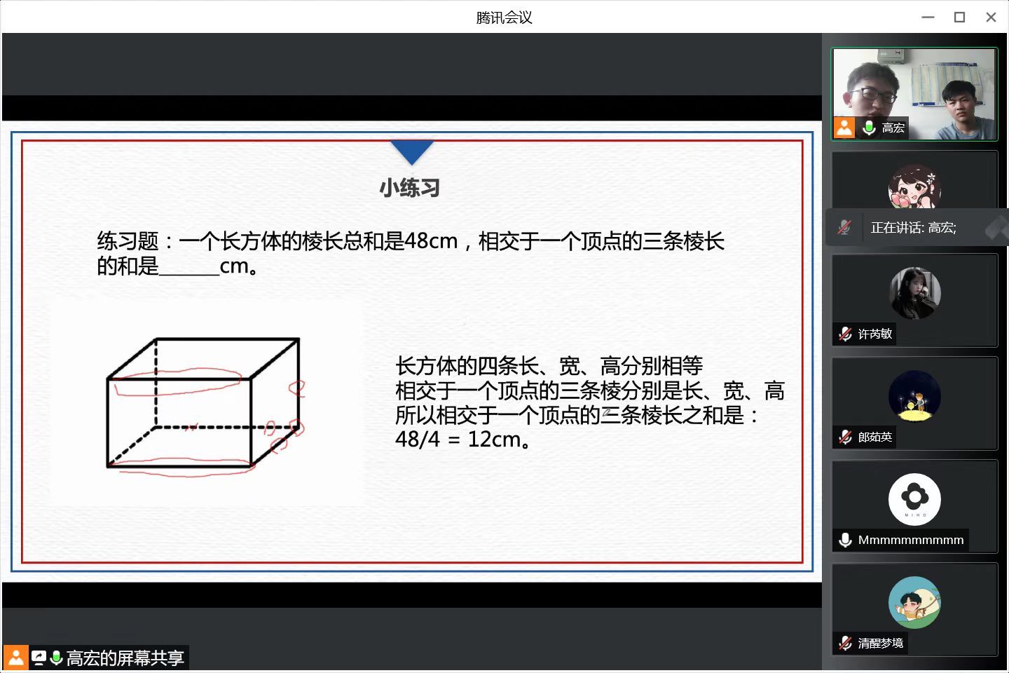 课堂伊始,高宏向同学们介绍了本次课程的教学内容,即正方体和长方体的基本知识及其综合题的解题方法,并通过例题讲解和随堂练习,帮助大家巩固知识点,提升解决立体图形问题的能力。