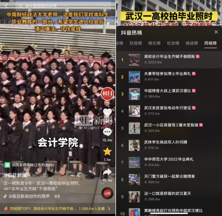 作为毕业教育系列活动,我院从2014年开始,注重培养学生清正廉洁守住底线的职业操守。在2022届本科毕业合影现场,467名学子在毕业生江剑的带领下,齐声高喊:会计学院,不做假账。相关视频传出后,楚天都市报等媒体迅速联系学院,制作相关视频在极目视频微信公众号,楚天都市报极目新闻官方抖音账号等媒体上发布,引发热议。视频发布三小时冲上同城热搜TOP1,热度在晚9点达到2200余万,288万多人观看,52万多点赞,15万多评论。中国新闻网、半月谈、山西融媒体、齐鲁新闻网等媒体纷纷转发。