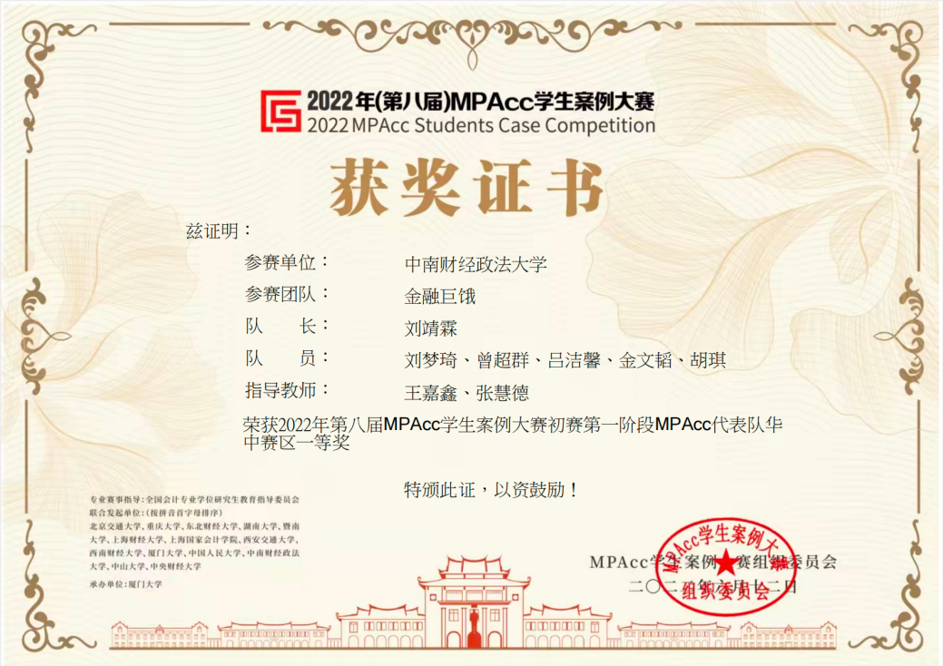 (撰稿人:胡琪,审核:王嘉鑫)2022年6月,由全国会计专业学位研究生教育指导委员会指导,MPAcc学生案例大赛组委会主办,北京交通大学、重庆大学、东北财经大学等14家国内高校培养单位联合发起,厦门大学承办的2022年(第八届)MPAcc学生案例大赛落下帷幕。在学院张敦力院长、殷修林书记的支持,王昌锐副院长的具体部署,以及全院老师的共同努力下,我院由王嘉鑫副教授、张慧德副教授指导,由刘靖霖、刘梦琦、吕洁馨、金文韬、胡琪、曾超群六位研究生组成的“金融巨饿”队从全国3564支参赛队伍中脱颖而出,荣获华中赛区第3名、全国前100名的优异成绩。