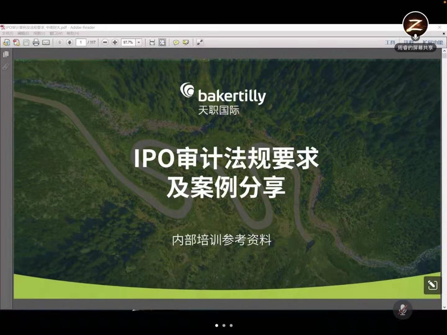 (通讯员:王嘉鑫、赵牧)为贯彻习近平法治思想,助力我国审计法治人才培养。2022年5月28日,在会计学院张敦力院长、殷修林书记和各位领导老师支持下,《审计法律研究与案例》课程开讲。本次课程邀请到天职国际会计师事务所合伙人周睿老师,为我院审计专硕讲授《审计法律研究与案例》课程,此次课程的内容为IPO审计法规要求及案例分享。课程采用腾讯会议的线上形式进行。该课程获得中南财经政法大学研究生教学教改项目立项,产生了良好的思政示范效应。