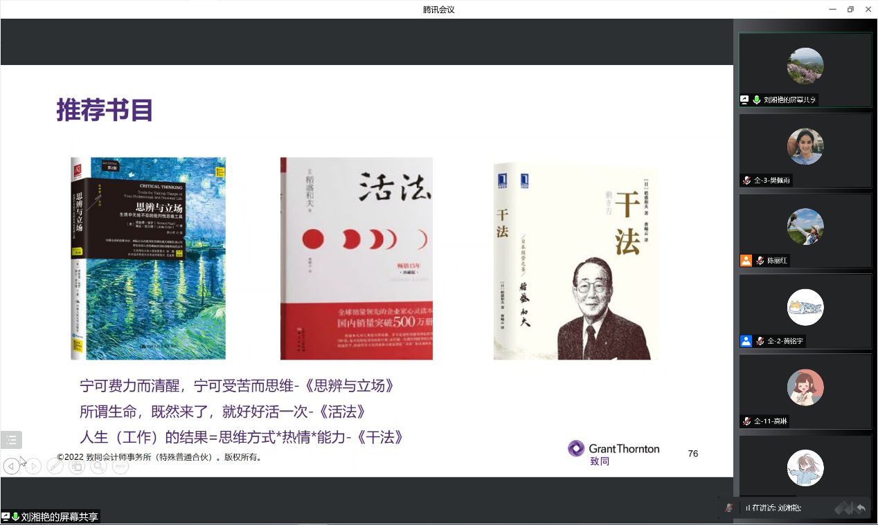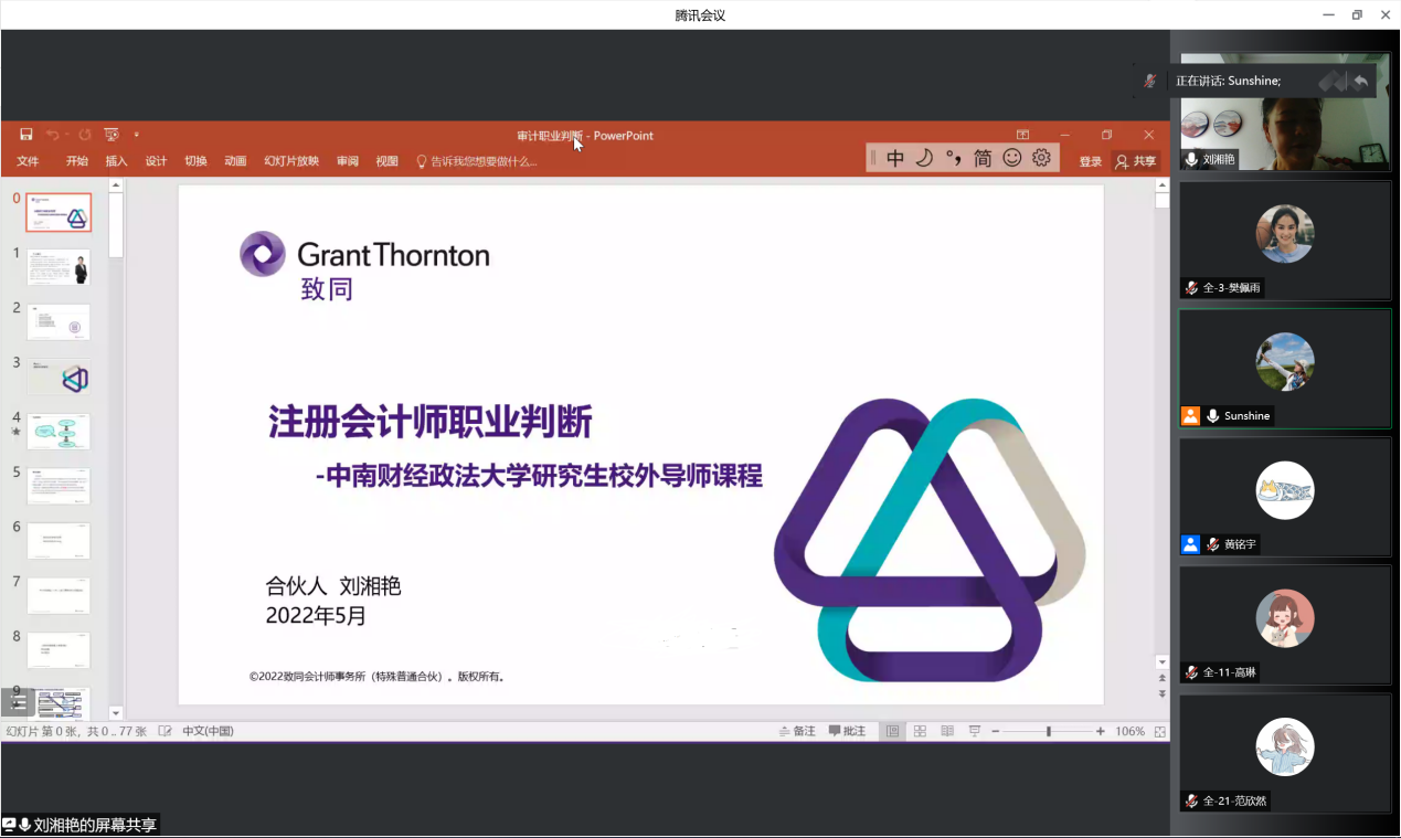 2022年5月29日,致同会计师事务所技术合伙人、工商管理硕士、全国会计高端人才信息化班学员、广东省注册会计师行业领军人才、深圳市注册会计师协会资深会员刘湘艳女士,应我院副院长陈丽红教授的邀请,通过“腾讯会议”向我院专业硕士,进行了主题为“注册会计师职业判断”的课程分享。在长达三个半小时的课程里,刘湘艳女士从何为人生最为重要的能力的底层逻辑作引,结合自己丰富的培训经验和人生感悟,从六个方面讲述了何为职业判断,以及如何建立注册会计师的职业判断,课程内容生动有趣,与实务紧密结合,同学们积极参与课堂提问与讨论,气氛活跃,展现了当代会计高端人才对“注册会计师职业判断”的深刻领悟与我院学子强烈的学习渴望。