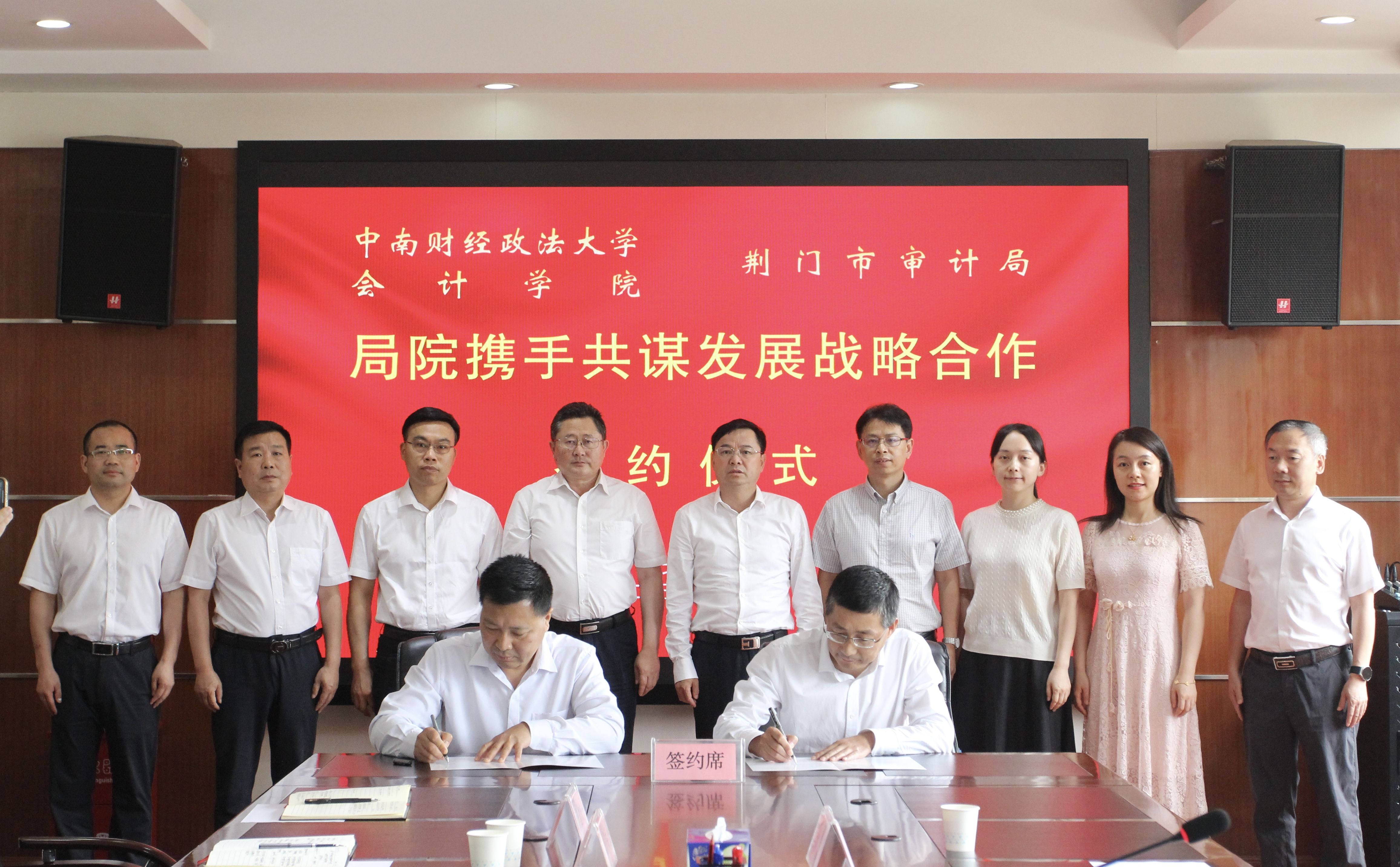 在与会人员的见证下,双方签约代表在战略合作框架协议文本上郑重签字,并交换协议文本。随后,双方领导共同为“中南财经政法大学会计学院实习实践基地”揭牌。