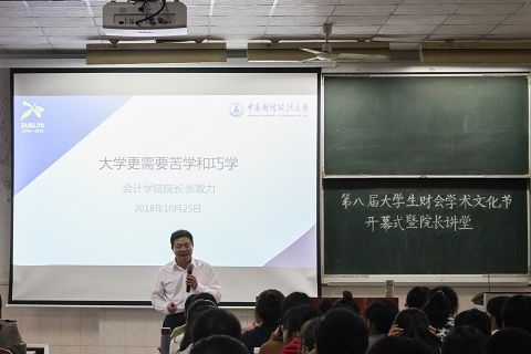 10月25日下午四点,第八届大学生财会学术文化节开幕式暨中南大讲堂之院长讲堂活动于文瀚楼501教室举行。本次中南大讲堂邀请到了会计学院院长、博士生导师张敦力教授担任主讲嘉宾,为18级新生带来主题为“大学更需要苦学和巧学”的讲座。学办主任孟曰老师、分团委书记张昭妍老师,分团委副书记杨少同老师参加本次活动。