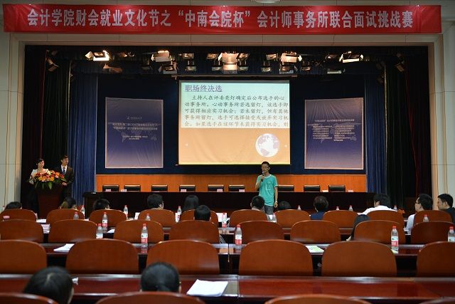 覆盖面广:依托财会就业文化节,汇集全校各院精英 本次比赛不是孤立的单个比赛,而是该院第二届(2013年)财会就业文化节系列活动的终极赛事。据该院党委王延副书记介绍,自今年3月至今,已举办了“‘青春风采’职场礼仪大赛暨校园财女郎选拔大赛”、“大学生职业生涯规划大赛”、“‘普华永道职场新锐’挑战赛”、“德勤实务精英大赛”等大型赛事,这些比赛的胜出选手又通过初赛、复赛、复活赛的层层筛选,最终从全校各院选手中确定26名精英进入总决赛。上述系列比赛覆盖近2000余人次,历时2个月,在校内及武汉市高校范围产生了较大影响。 参加决赛的选手各个身怀绝技,能力出众。在“职场初体验”环节,选手们以自制“小电影”、视频、PPT等形式、中英文双语展示各自风采、彰显自我特色;在“职场再判断”环节选手又随机选取“答题大礼包”进行现场答题,题目涵盖财会知识、时事热点、行政能力、文学常识与专业英语等;在“职场面对面”中仍对选手感兴趣的事务所代表与选手一起开展职场面试,进行现场提问。整个过程,选手们表现自如,充分展现了中南大学子敢想敢做,勇敢展现的精神。
