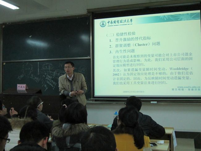 讲座最后,何威风老师以自己所撰写的《管理者晋升动机与企业盈余管理行为研究》这篇文章为例,再次从选择主题、提出问题、研究假设、研究设计和实证分析等方面对实证论文的撰写过程向同学们做了详细的讲解。并鼓励同学们在撰写论文的过程中要有耐心、有信心、有恒心,只有坚持不懈才能做出好的研究。在听了何老师生动的讲解后,一些同学也对控制变量的选择、内生性问题的检验等向何老师提出了疑惑,何老师也一一回答了这些问题,在一阵阵热烈的掌声中,本次讲座圆满落幕。