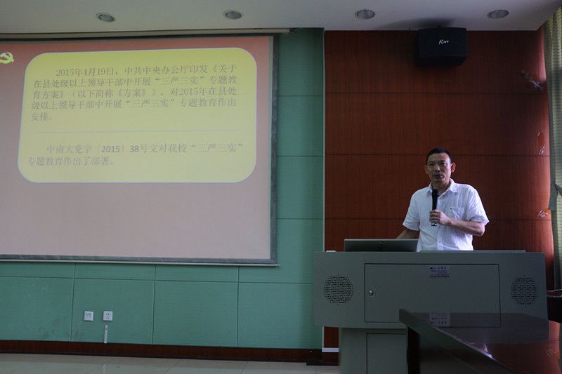 随后,肖翠祥书记对“三严三实”专题知识进行了详细讲解,讲解的主要内容包括“三严三实”的提出、“三严三实”的意义、“不严不实”的表现以及应如何践行“三严三实”等四个方面。肖书记说,“三严三实”是习近平总书记在2014年3月18日第十二届全国人民代表大会第二次会议安徽代表团会议所作关于推进作风建设的讲话中首次提出的,并在一年多的时间里得到了不断的发展。“三严”是指严于修身、严于用权、严于律己;“三实”是指谋事要实、创业要实和做人要实。“三严三实”是党的优良传统和政治优势的继承和发展,是协调推进“四个全面”战略布局的坚实保障,也是锻造过硬队伍、推进事业发展的需要。肖书记列举了有关媒体报道的全国及各省市范围出现的和学校党委总结的“不严不实”行为,结合学院实际,总结出了学院范围内存在的“不严不实”的行为,并结合实际问题对如何践行“三严三实”提出了要求:要紧扣主题,学习“三严三实”;突出深化学习教育,解决“不严不实”突出问题;把握从严要求、以上率下、讲求实效三个要求;抓好专题党课、专题学习研讨、专题民生生活会和组织生活会以及整改落实、立规执纪四个动作。