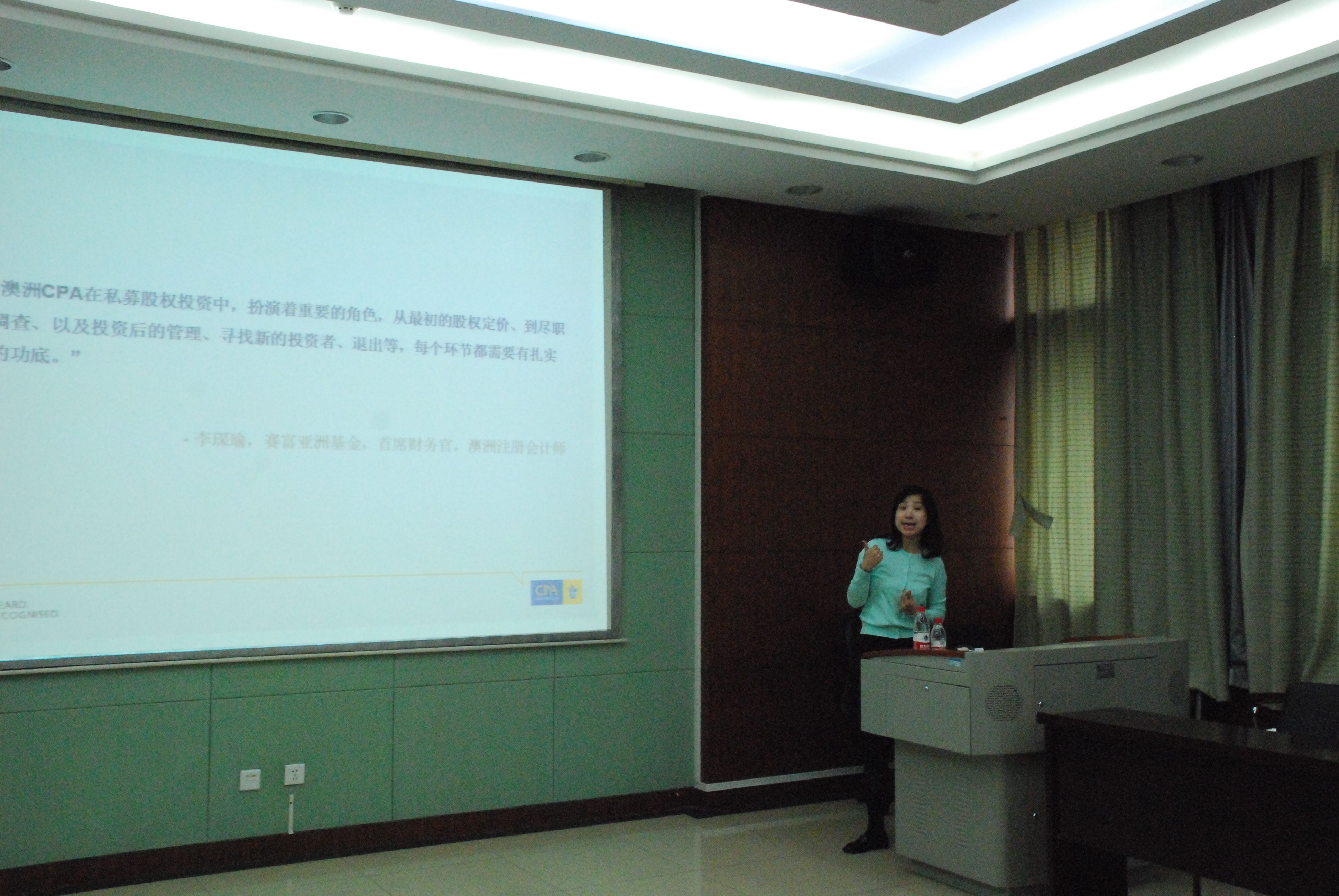 (撰稿:朱芳菁 审核:王芹)2015年11月19日上午,澳洲会计师公会钱茵经理为我院学生开展一场职场导航分享会。本次分享会从澳洲会计师公会的基本情况、澳洲CPA的主要择业领域、澳洲会计师公会给予会员的相关活动展示、澳洲CPA network的构建和发展以及奖学金申请和课程的详情等五个方面进行。钱茵女士向同学们重点介绍了澳洲注册会计师的雇主选择和主要发展行业,并对澳洲会计师公会举办的各项活动进行举例,详细说明澳洲会计师公会对会员职业发展、技能提升和人脉拓展方面的帮助。