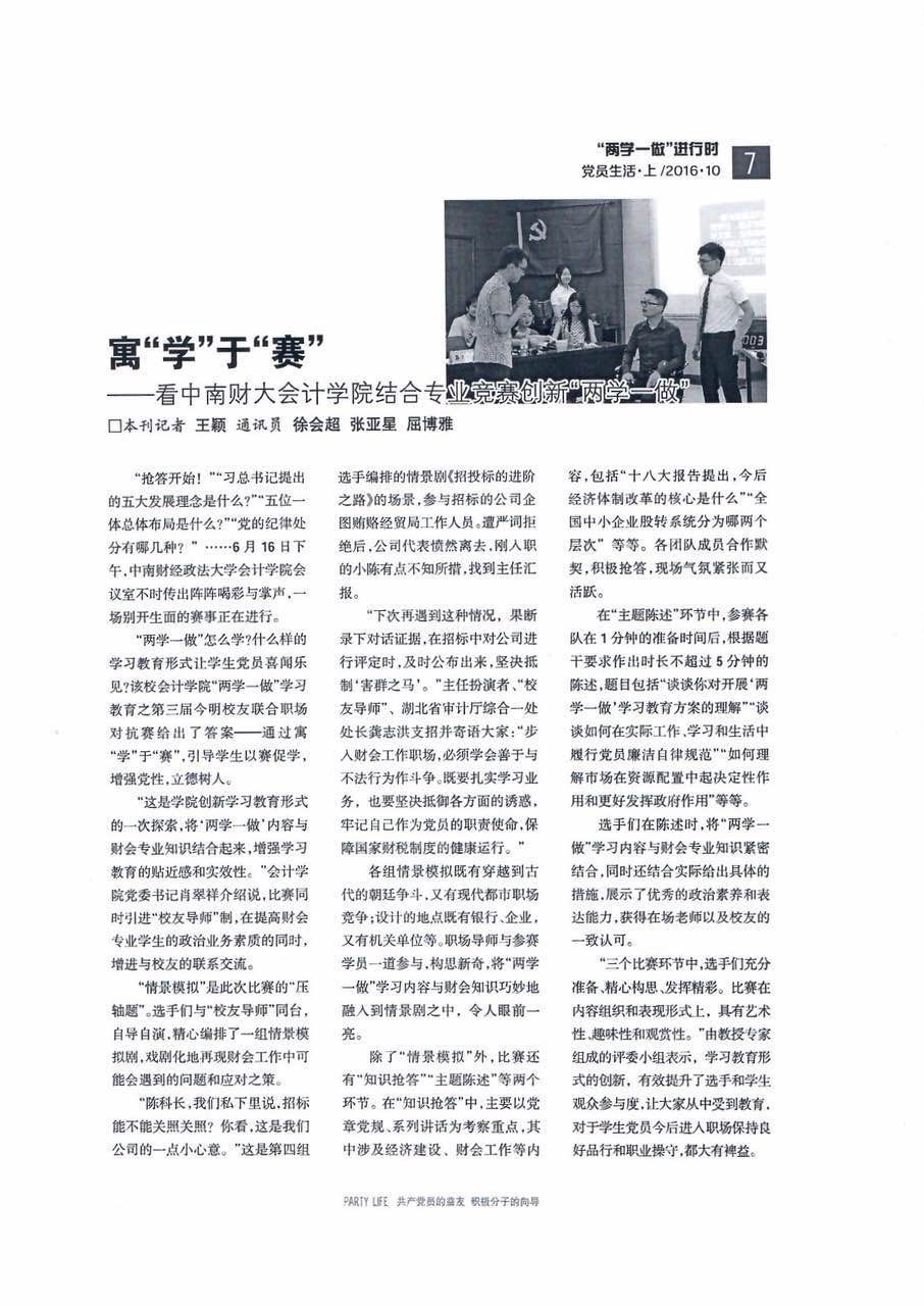 近日,我院党委收到《党员生活》杂志社寄来的刊物获悉,我院“两学一做”学习教育之第三届今明校友联合职场对抗赛被收录进《党员生活》2016年第10期,全文如下: