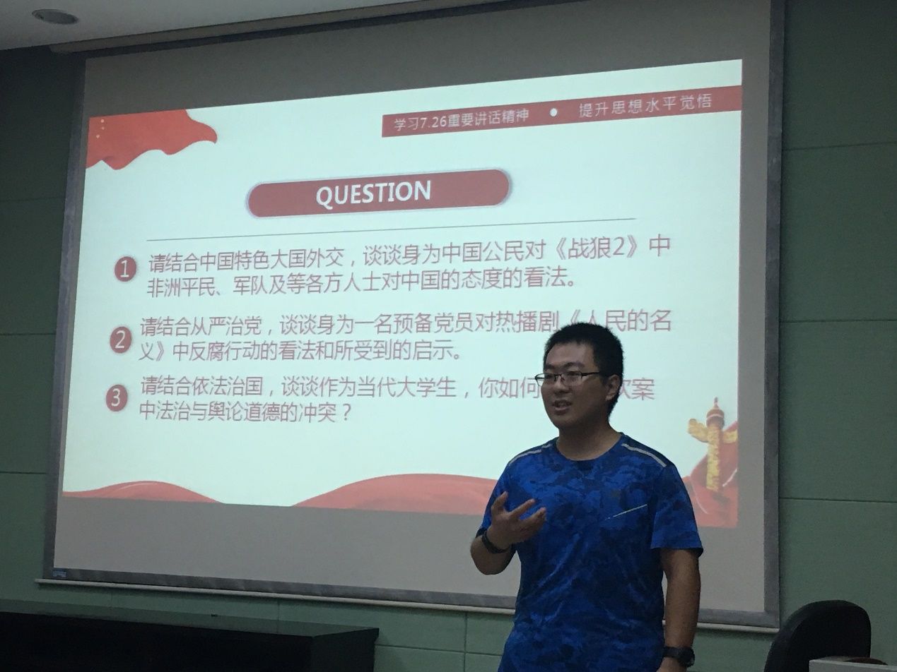 最后,支部书记陈楠总结发言,对大家学习“7.26”讲话内容的态度和成果表示肯定。对于此次活动,她也给予了认可,也勉励大家建言献策,使主题党日活动形式多样化。同时她还呼吁大家深入同学中间,互帮互助,发挥好党员模范带头作用,时刻保持党员精神风貌。