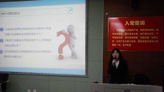 我校博士研究生梅维佳作题为《土地承包经营权主体制度的困境与出路》的论文展示。他考察土地承包经营权主体实践困境,并从本体制度和配套制度这两个方面进行了原因分析,认为土地承包经营权主体应规定为集体经济组织成员,土地承包经营权项下的户内成员为准按份共有关系,还应建立健全土地承包经营权得丧变更机制。