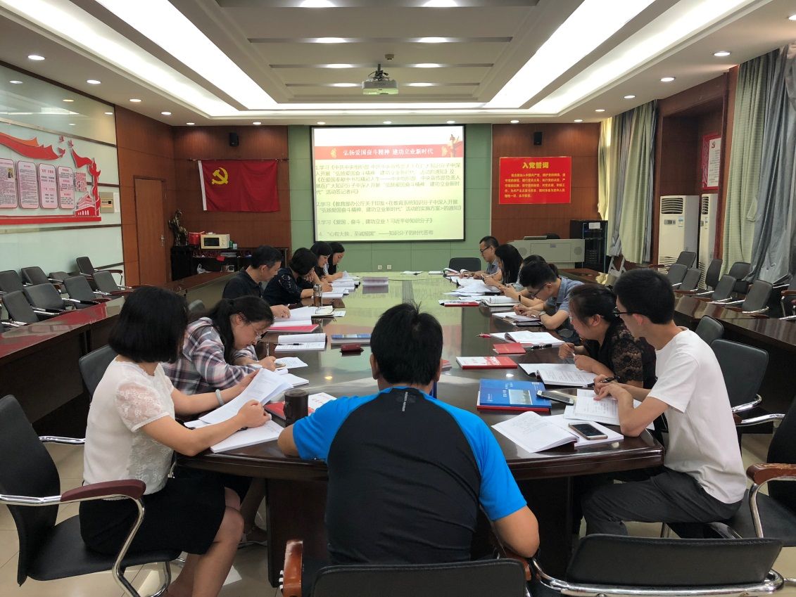 在重温入党誓词、现场交纳党费、诵读党章之后,由陈楠同志、林琳同志、范纯琍同志、杭慧喆同志共同带领开展“弘扬爱国奋斗精神、建功立业新时代”为主题的专题学习和大讨论。会议深入学习了中组部、中宣部、教育部关于开展“弘扬爱国奋斗精神、建功立业新时代”活动的有关通知要求及近年来习近平总书记对全体知识分子说的关于爱国奋斗、建功立业的知心话,还共同学习了王向明教授、钱学森、邓稼先、郭永怀等老一辈知识分子的家国情怀和奉献精神,和黄大年、李保国等为代表的新时代优秀知识分子的感人事迹。